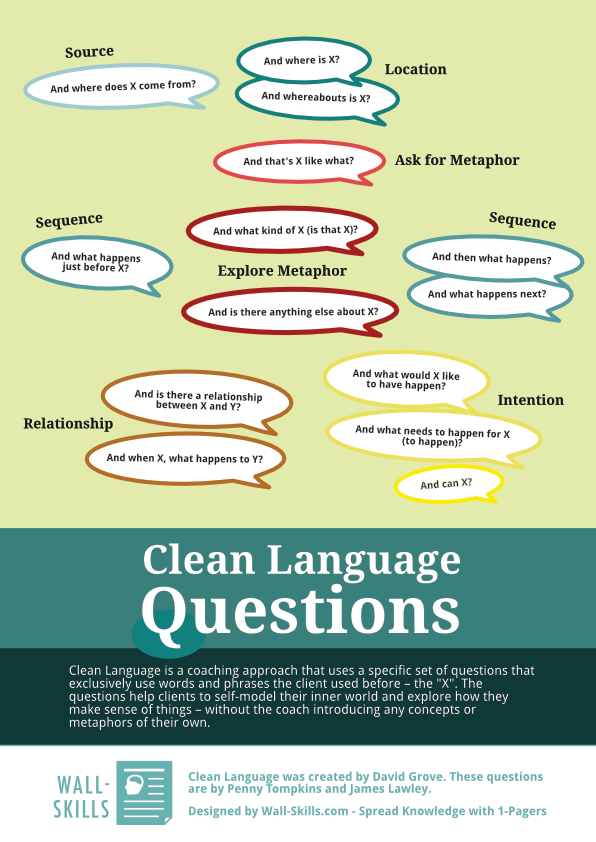 Clean Language is a coaching approach that uses a specific set of questions that exclusively use words and phrases the client used before ā the “X”. The questions help clients to self-model their inner world and explore how they make sense of things ā without the coach introducing any concepts or metaphors of their own.